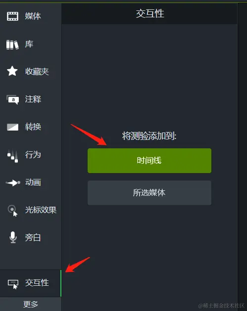 现在我们将时间轴调到需要加入测验问题的位置,然后在工具栏底部的“更多”中找到“交互性”。点击后,选择将测验添加到“时间线”,如图2所示。