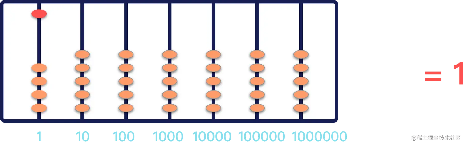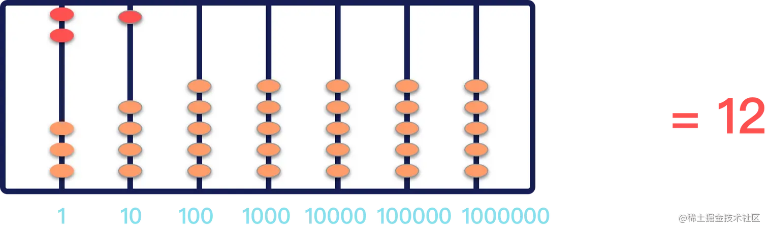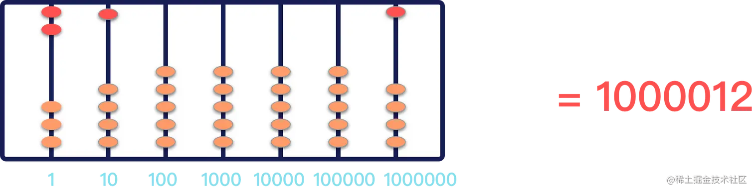 可以看到算盘提供了一组运算法则,每增加一格,里面的珠子可以容纳之前一格左右的技术容量(我们图示中因限制一格只画了 5 个),而每格里面珠子的移动状态在计算时会被存储下来,方便人直观的了解目前算到了哪里。