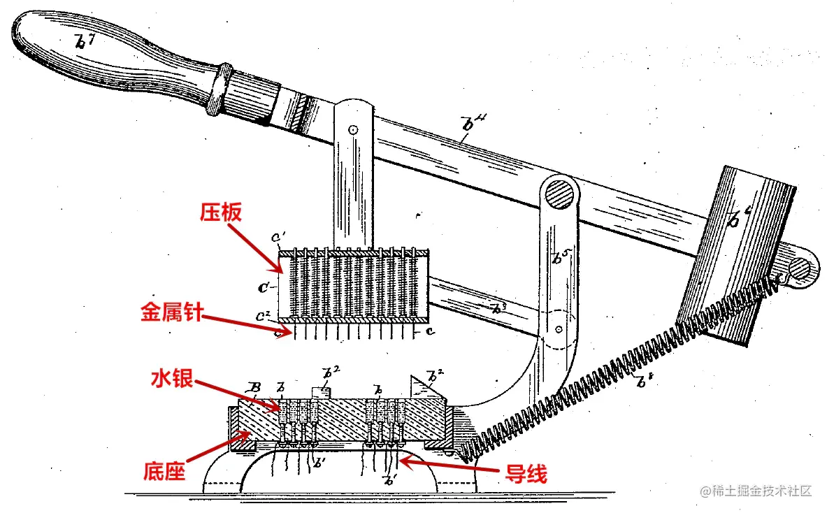 读卡装置就是上述的图示,金属针和水银之间放入打孔卡片,如果卡片有孔,那么金属针就会和水银接触,激活电路。