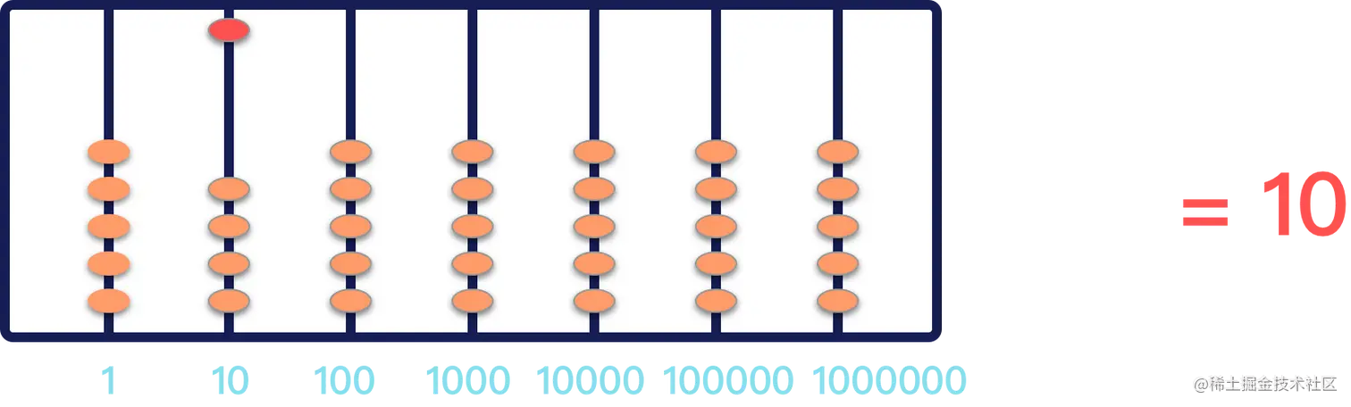 - 每往上一格,数字翻 10 倍,也就是第二格的珠子每移动一个,计数就加 10,第三个的珠子每移动一个,计数就加 100