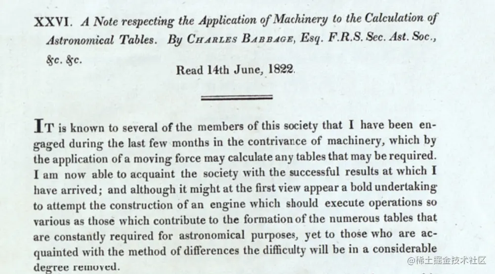 对于每次换一种设备就需要重新计算一张表这种重复劳动,虽然繁琐耗时耗力,但是当时的社会与政府也没有什么好的办法,只能日复一日的这样去处理。而巴贝奇认识到这一点存在严重的问题,在 1822 年,巴贝奇在他的论文:“机械在天文与计算表中的应用”,向英国皇家学会指出了这个问题。