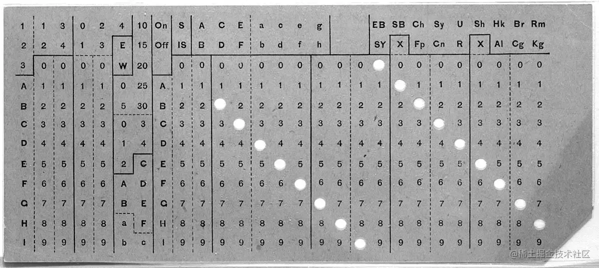 而上图中的操作面板类似现代的键盘,将打孔卡片里面所有可操作的位置进行复刻,然后操作人员在操作面板上操作要打的孔,对应的卡片上的操作杆就会在对应的卡片上打下对应的孔,类似我们现在在键盘输入 “字母”,屏幕上就会显现出对应的字母一样。