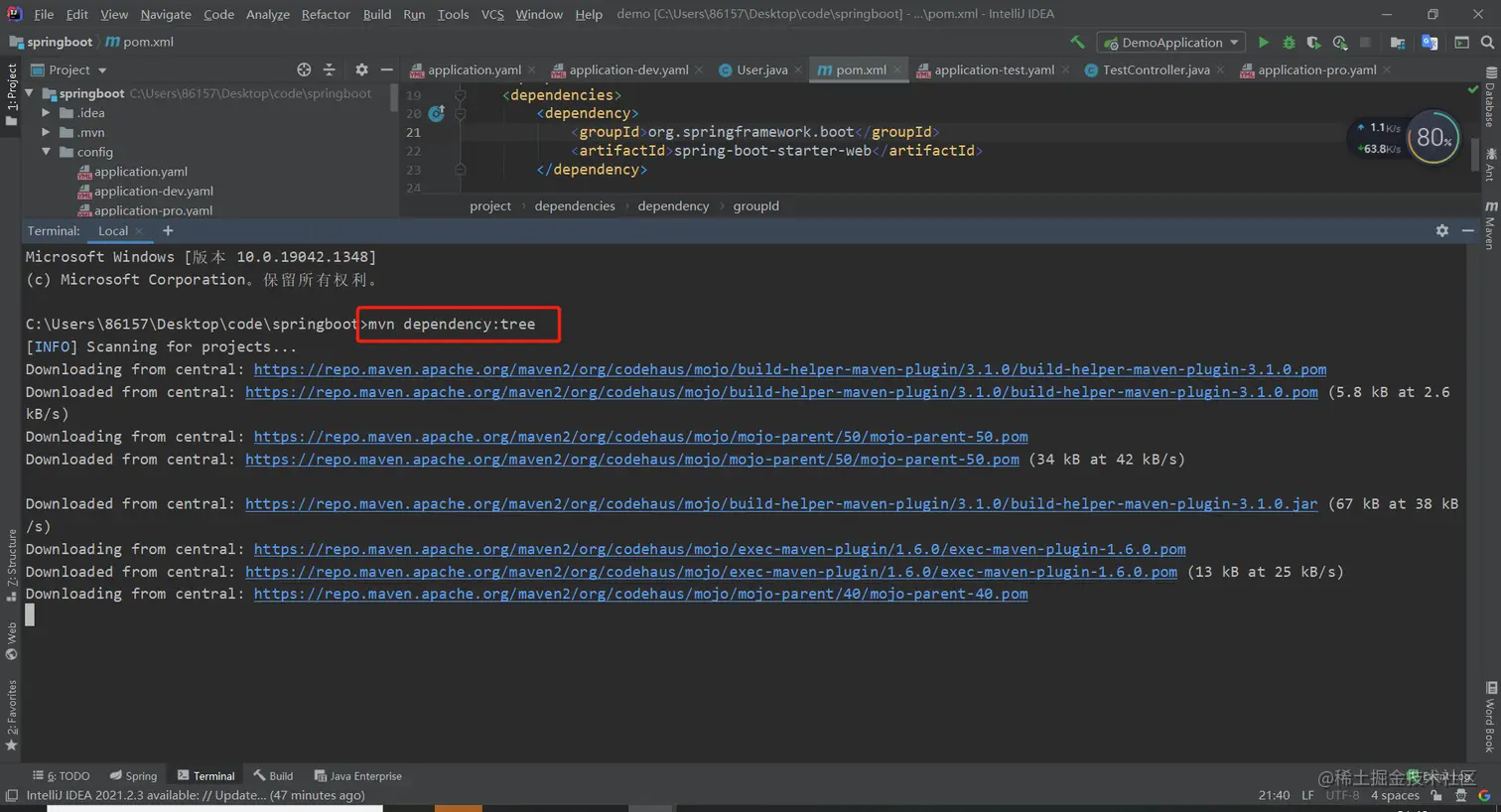 导入依赖后,你也可以查看下该项目的依赖树,执行以下 mvn 命令查看器依赖树。