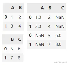append() 在默认情况下会沿y轴垂直拼接两个 DataFrame ,df1,df2 交集外的列填充 NaN。