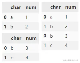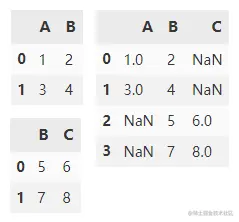 concat() 可用于两个及多个 DataFrame 间行/列方向进行内联或外联拼接操作,默认对行(沿 y 轴)取并集。