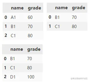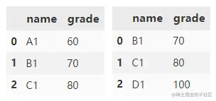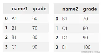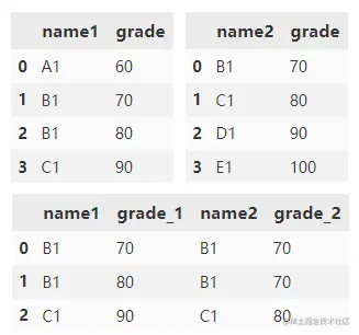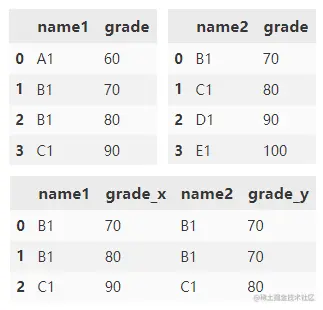 根据 name1 和 name2 列合并 df1 和 df2。 grade 列附加了默认后缀 _x 和 _y。