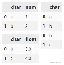 merge() 只能用于两个 DataFrame 间列方向进行内联或外联合并操作,默认列合并(沿 x 轴),取交集(即:以两个 DataFrame 列名的交集作为连接键)