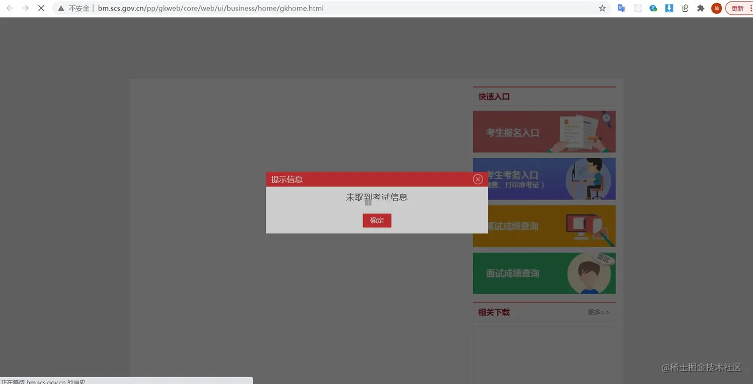 今天是国考出准考证的时间,刚好女朋友也要报名了这次考试,作为合格的男朋友当然是要在第一时间将准考证信息下载下来。结果到了半夜12点之后,整个官网一直处于无法连接、502、503、接口报错等各种问题。到了凌晨1点才把准考证下载下来。作为程序员自然要好好分析下这一个小时官网究竟发生了什么事情。