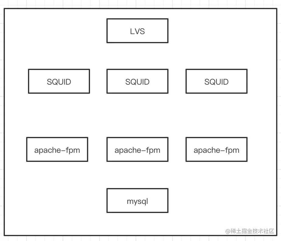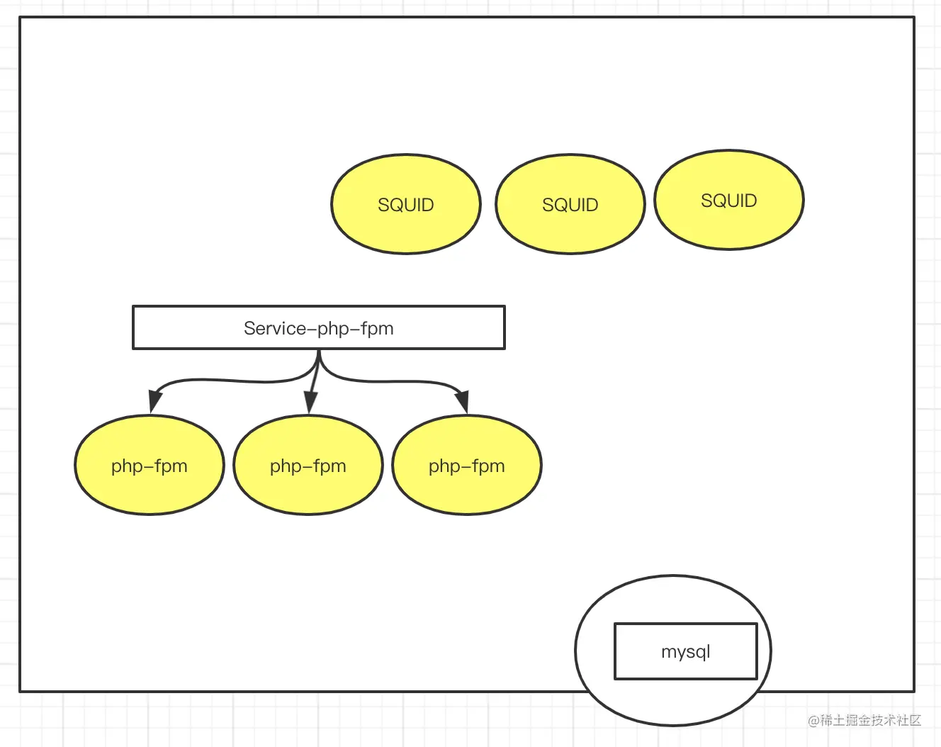 有一个myqsl, 三台apache-fpm, 三台缓存服务器SQUID, 有一个负载均衡器LVS. 我们来分析一下, 如果把它放到k8s中如何部署.