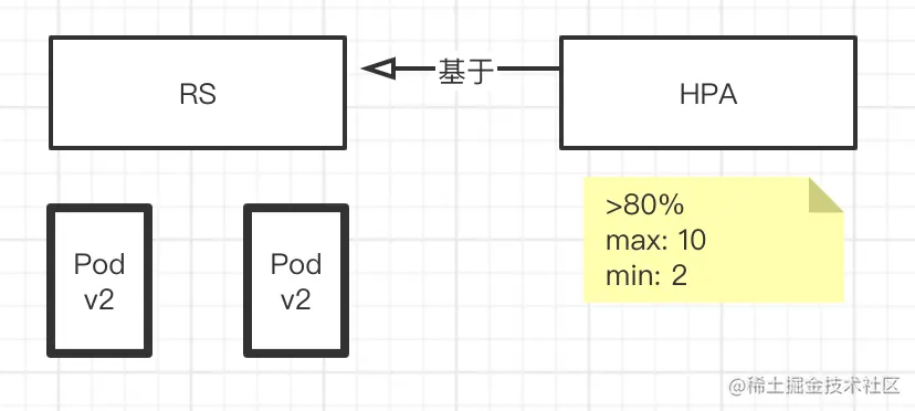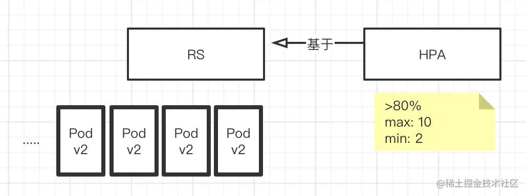 也就是说HPA会去监控RS下Pod的资源利用率. 如果资源利用率>80%, 那么开始扩展Pod, 然后判断是否依然超过80%, 如果是 继续扩展. 直到扩展到资源利用率低于80%, 或者最大数达到10个.