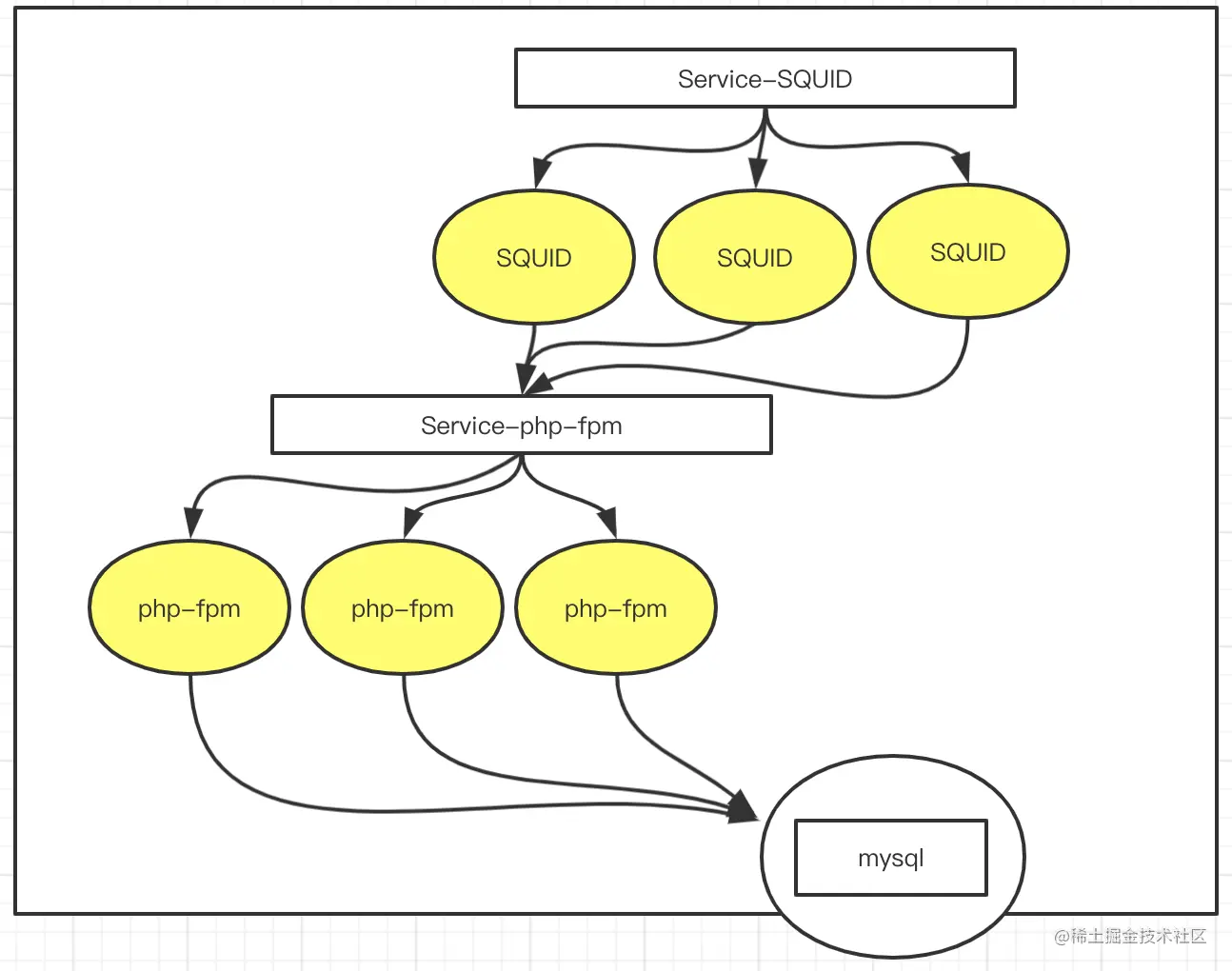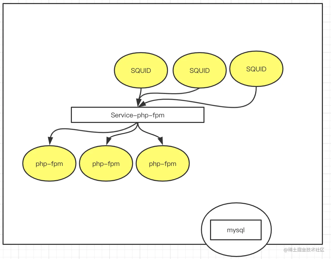 现在这种结构, 我们发现, 如果缓存服务器SQUID想要访问apapche-fpm, 写反向代理的话, 需要写三台服务器. 并且, 我们说过, pod如果退出重新创建以后, pod的ip地址会变换. 除非采用的是statefulSet, 但是在apache-fpm中没有意义, 因为他是一个无状态服务 . 那怎么办呢? 我么可以在前面 加一个service, 这个service就是Service-php-fpm的. 他会绑定我们的标签.