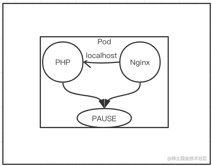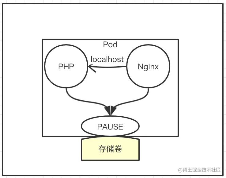也就是说, 这两个容器没有自己独立的ip地址和存储卷, 或者说, 他们有的是PAUSE或者pod的ip地址. 这两个容器他们尾根隔离, 但是进程不隔离. 也就是说, 如果容器1运行的是php, 容器2运行的是nginx, nginx想要反向代理访问php, 只需要要写localhost:9000即可. 不需要写IP地址+端口映射. 原因是这两个容器共享的是PAUSE的网络栈.