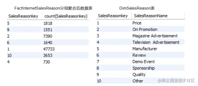 背景:数据来源于微软示例数据库,一家销售自行车制造公司的销售数据,公司为了改善产品,增进用户体验,需要了解顾客购买产品的消费理由,现在公司收集到两张表,一张FactInternetSalesReason表,包含订单号salesordernumber和SalesReasonkey在内三个字段,共计64515条记录,另一张表DimSalesReason记录每个销售因素,包含SalesReasonkey和SalesReasonName在内四个字段。因FactInternetSalesReason数据量大,现在先分组聚合后展示接下来将要操作的两张表的数据,让大家更清楚理解过程和结果: