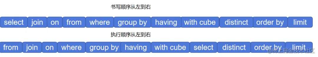 初学者应该都知道SQL的书写顺序和执行顺序不一样,下面这张图分别显示了是怎样的顺序: