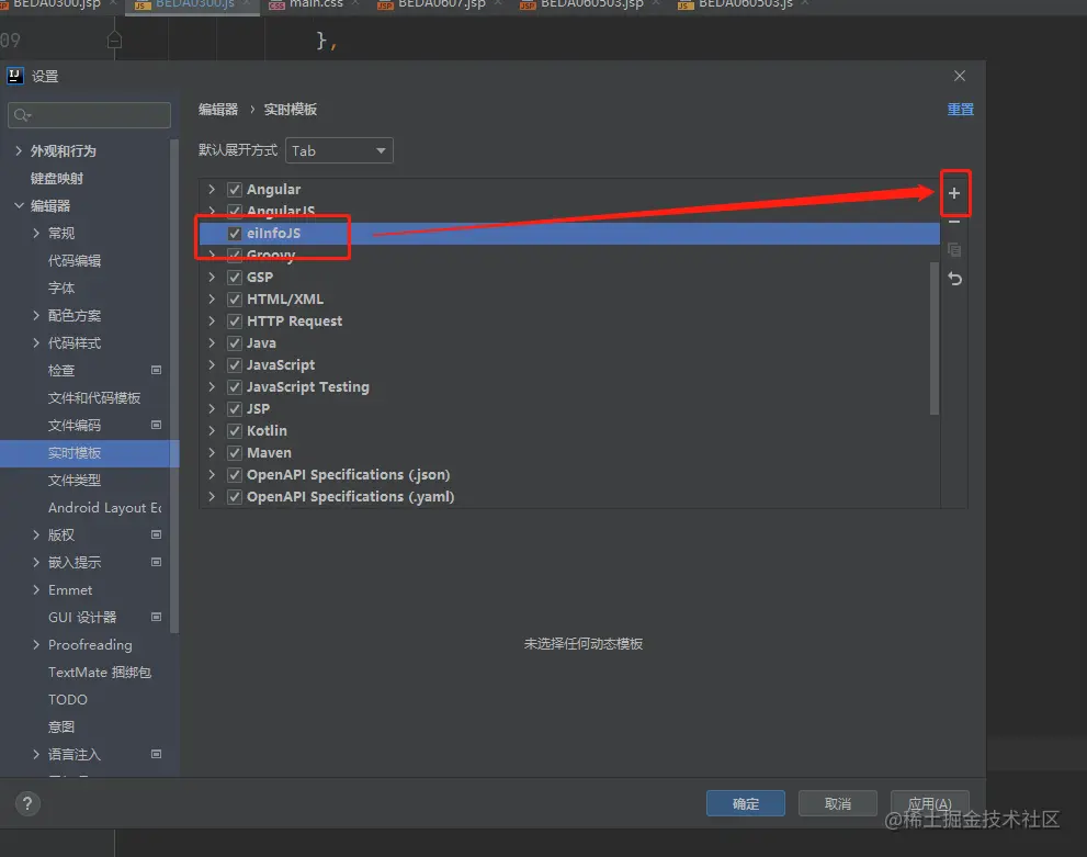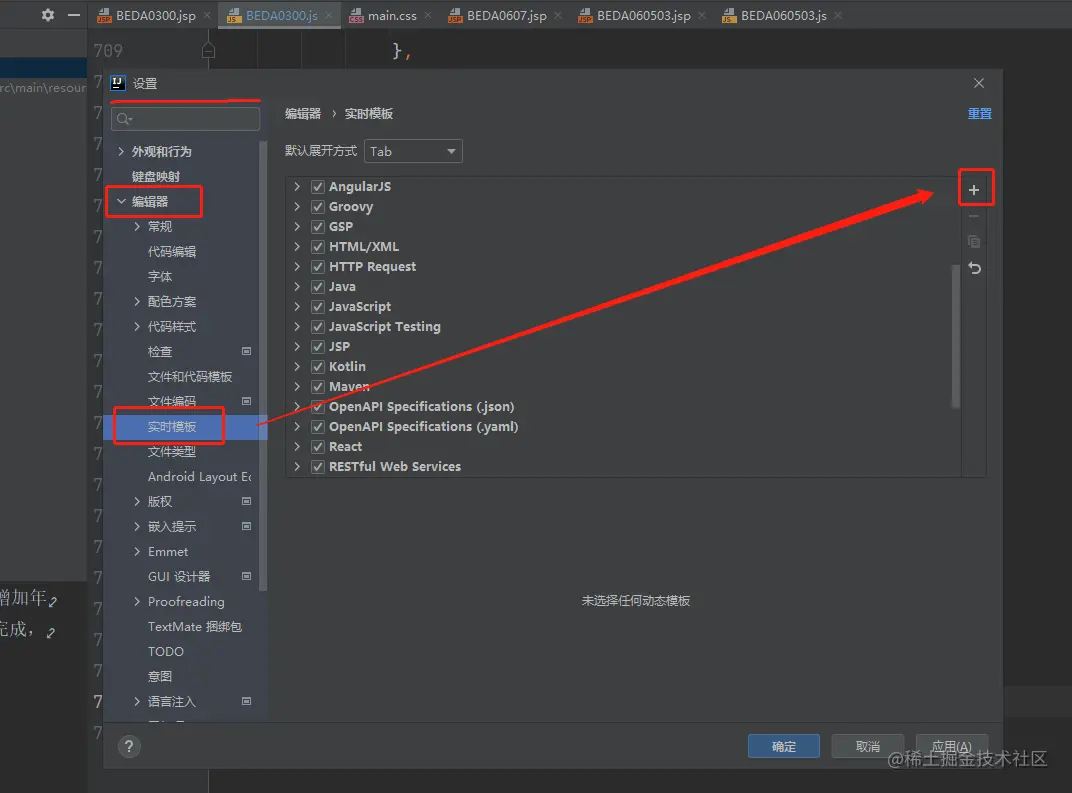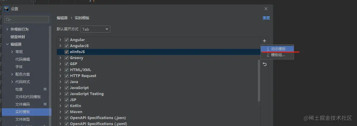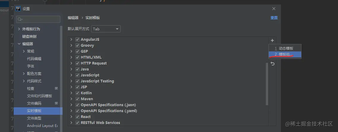 打开IDEA后,使用快捷键Ctrl+Alt+S 出现“设置” 界面,选中“编辑器”(Editor)——“实时模板”(Live Templates).点击右侧加号(+),选择Templates Group,新增一个“模板”组