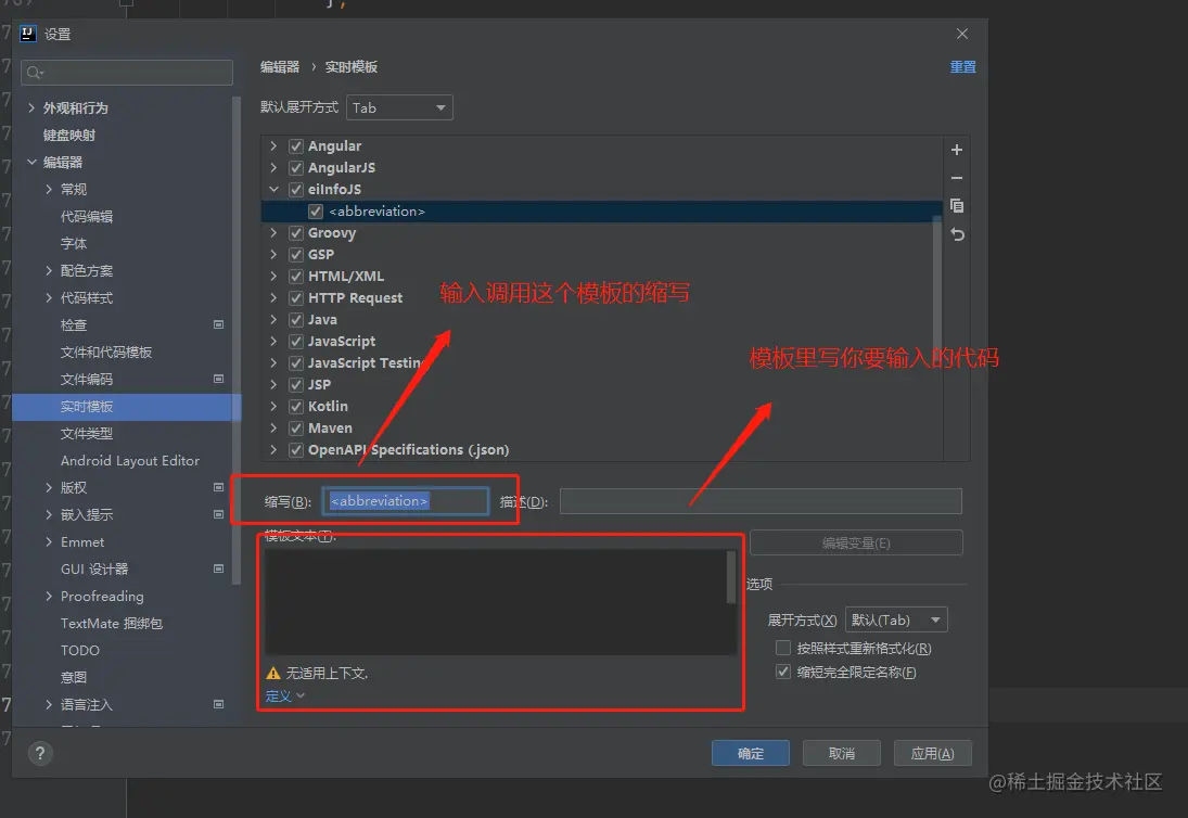 选出代码模板使用的场景,以后这些代码就可以在这些地方使用了,最后点“确定”完成模板