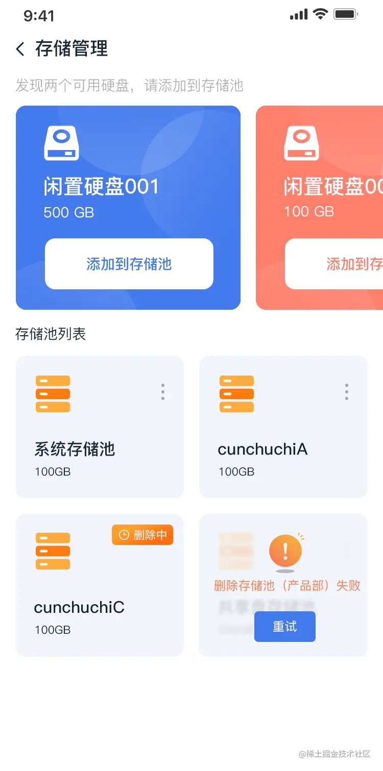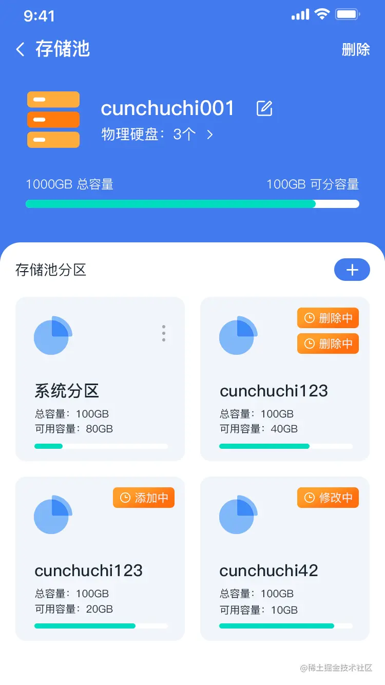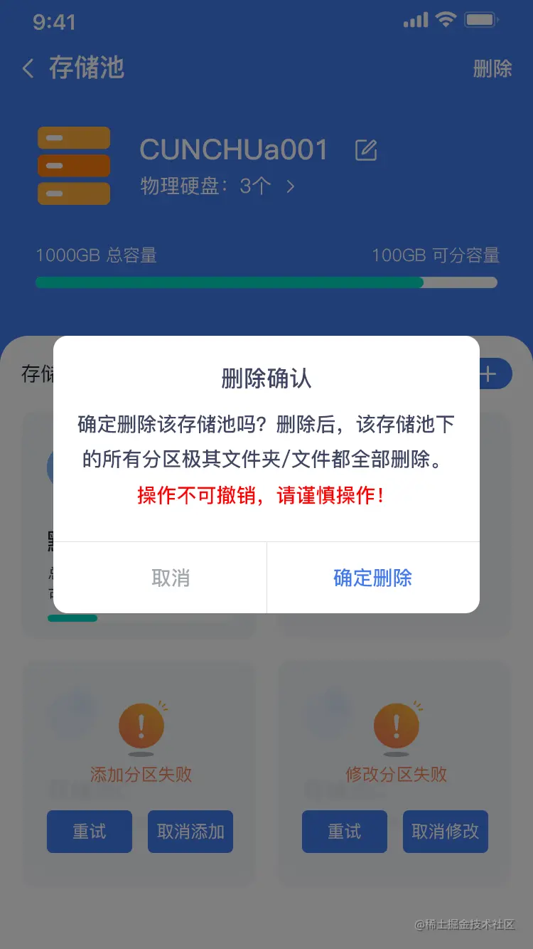 - 点击右上角的【删除】,可删除该存储池。删除后,所有相关的内容都被删除,且不可恢复。