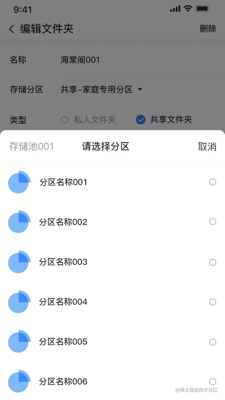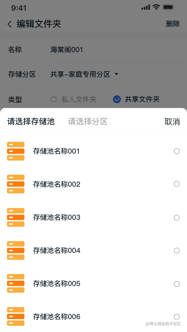 在存储池下,可添加分区,在分区列表点击右上角的添加图标,进入新增页面。点击对应的分区,可编辑分区名称和容量。