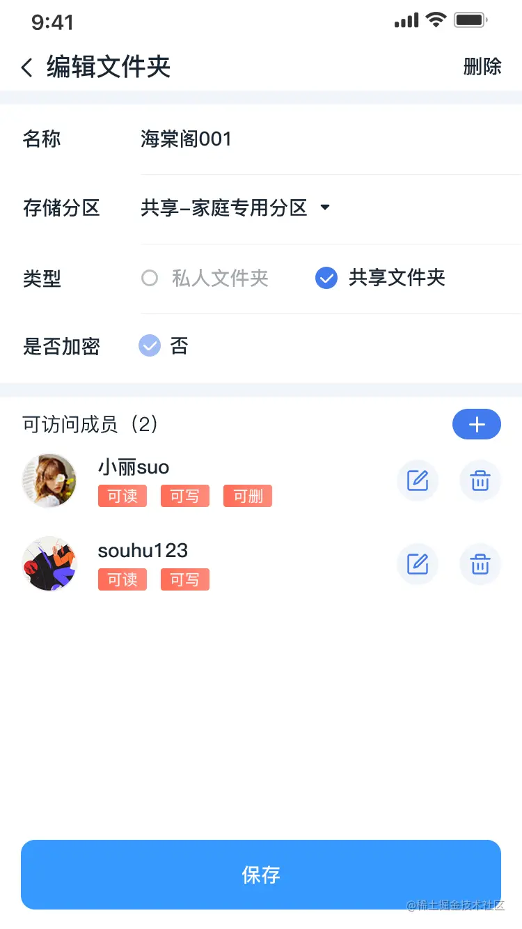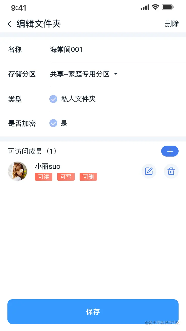 点击对应的文件件,进入到该文件夹的编辑页面,可修改名称、存储分区、成员及对应的权限。