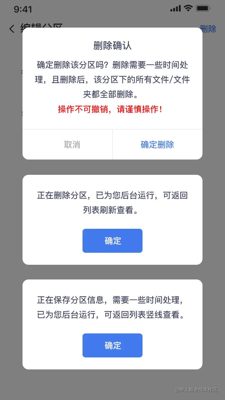 编辑分区时,点击右上角的【删除】,可把对应的分区删除,页面如下所示: