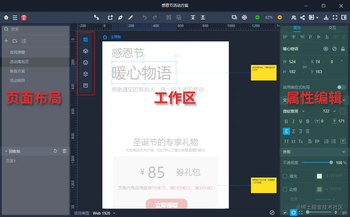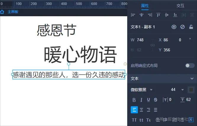 而右侧的属性和交互,则是针对页面中一个具体的元素进行相关的调整。就像页面中的一句文本,若要更改他的字体、大小、间距等,都需要在右侧属性栏进行操作。