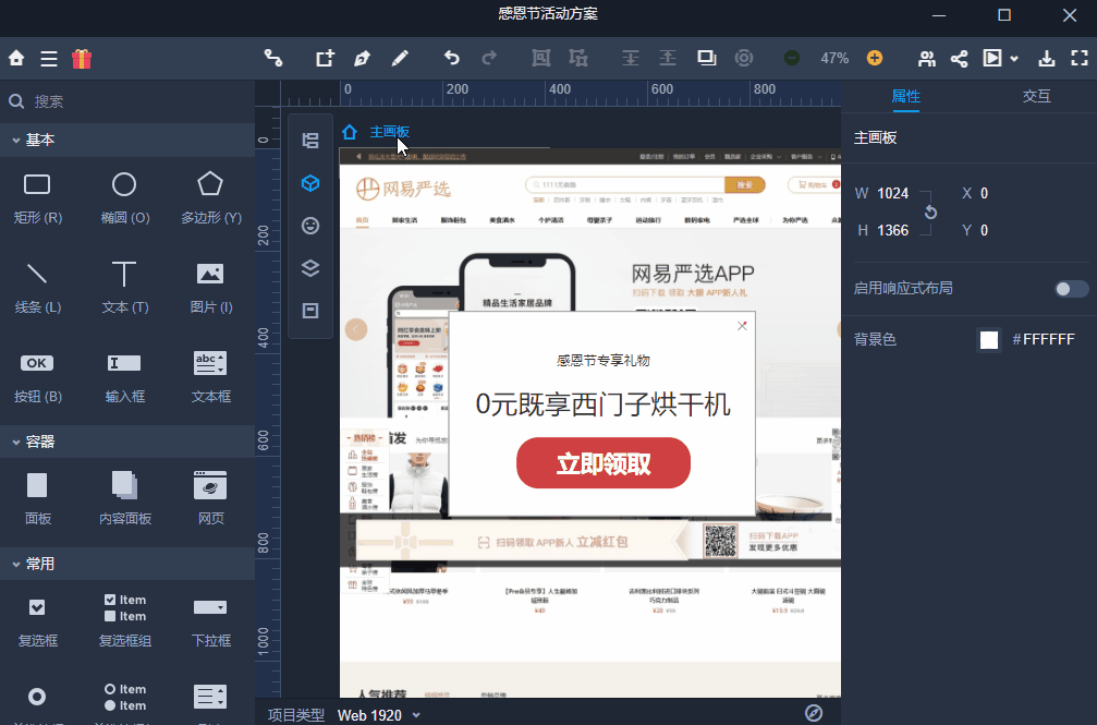 作为运营,我们最常用到的板块是矩形和文本框,所以将对应的元素拉进页面并修改其属性,就可以快速完成内容填充。