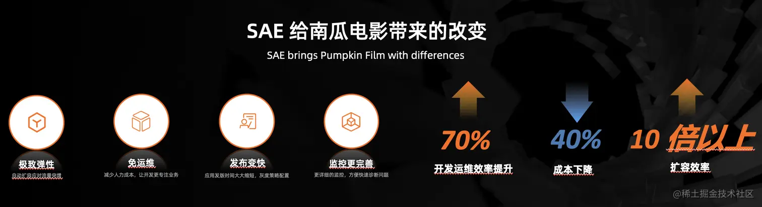 另一个比较有意思的案例是南瓜视频使用 SAE 实现传统微服务应用的零迁移改造,只用了一周就完整迁移到 SAE 平台。
