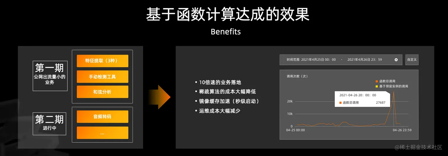 比如上线一种新算法,首先要对超过 6000 万首存量歌曲进行处理,这要求平台在短时间内弹出大量算力,可靠的执行任务,同时提供完善的应用、实例等多维度的监控信息。这些需求是非常匹配函数计算的。网易在函数计算上高峰期一天处理超过 2000 万个任务,算法应用到业务 10 倍速的提升,稀疏调用的算法成本大幅缩减。