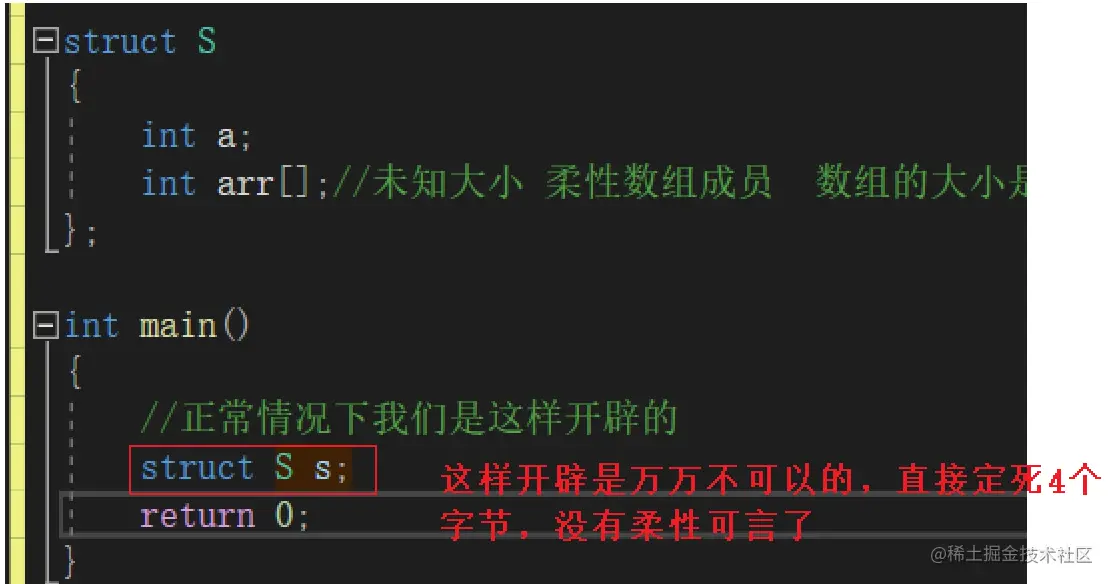 - 包含柔性数组成员的结构用malloc ()函数进行内存的动态分配,并且分配的内存应该大于结构的大小,以适应柔性数组的预期大小