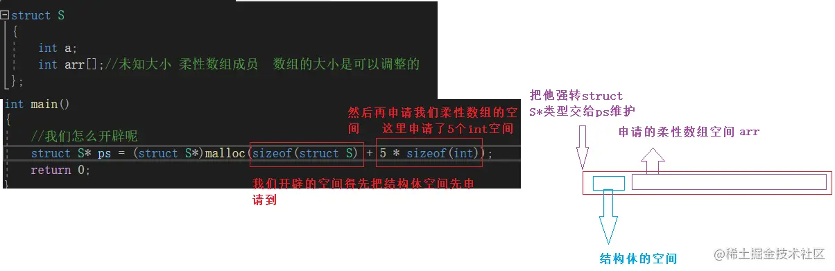 struct S* ptr = (struct S*)realloc(ps, sizeof(struct S) + 10 * sizeof(int));//先交给ptr,防止内存调整失败