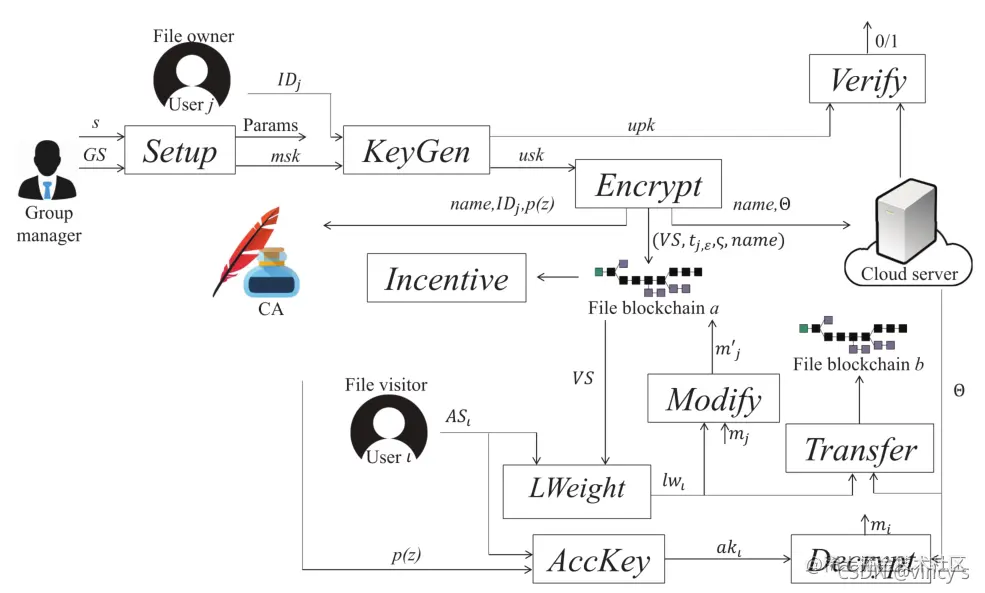 - 上传数据:用户将数据加密至云端,访问策略计算为一个多项式发送给CA,将访问控制策略中各个属性要求的值和访问需要达到的阈值发送到区块链,区块链会返回给用户奖励