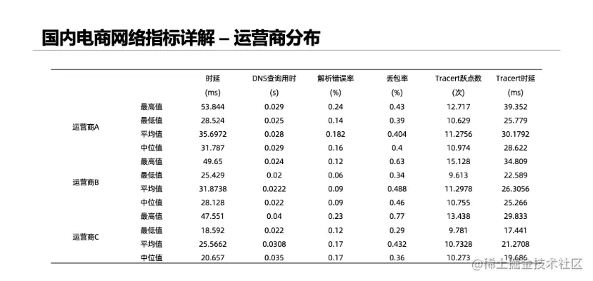 各电商三大运营商表现来看,DNS查询时间普遍控制在0.02s左右,丢包率控制在0.8%以下。