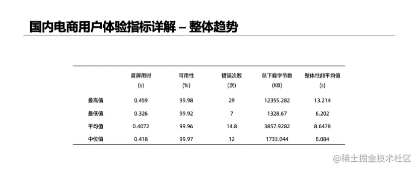从整体趋势上来看,国内电商平台整体性能趋势平稳。整体性能方面,大部分电商均维持在9s以内。其中整体性能最高值13.214s,主要是 由于总下载字节数、平均页面体积较大。首屏用时方面,各厂商表现优秀,均在0.5s以内,客户可以快速浏览到页面内容。可用性方面,各 厂商均在99.9%以上,行业表现优秀。