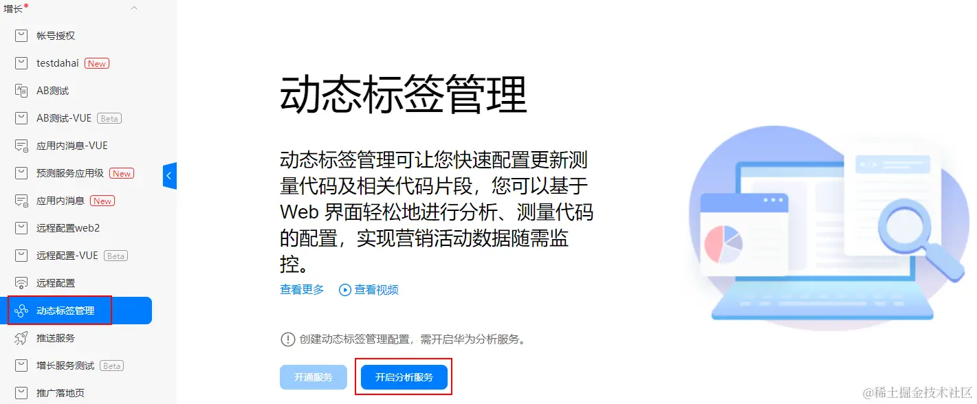 第4步:登录AppGallery Connect网站,选择"我的项目 > 增长 > 动态标签管理",并启用它。