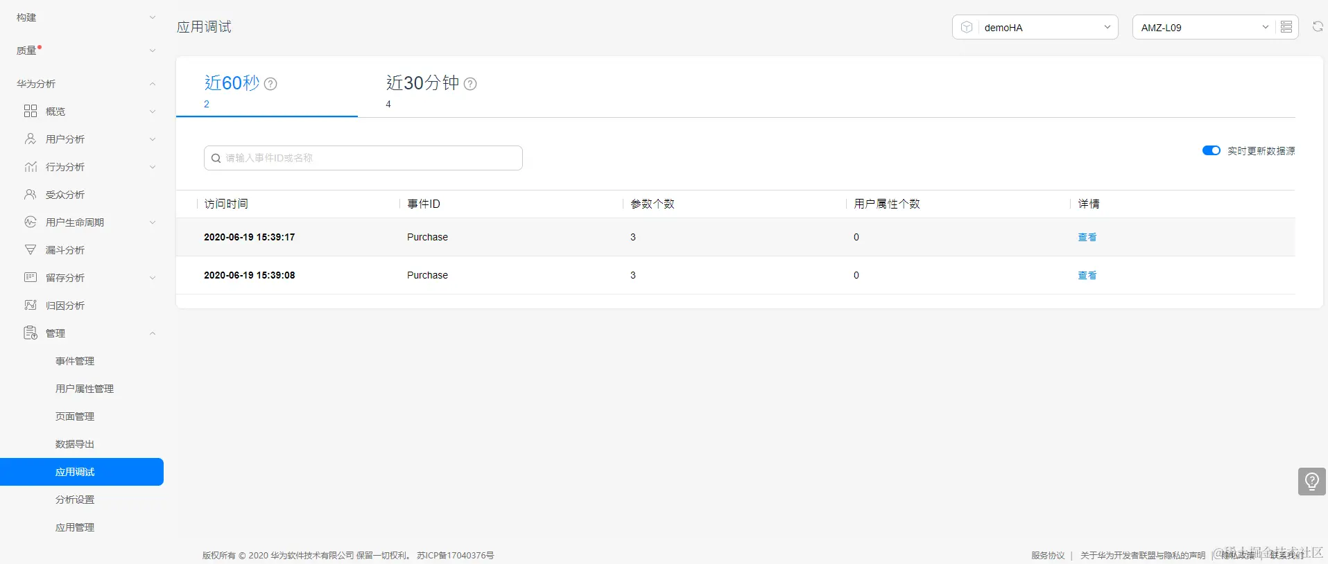 步骤11:选择“项目设置>华为分析>应用调试”,打开“应用调试”,获取实时分析数据。