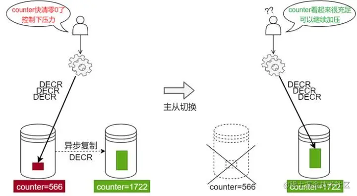 当给Redis配置从服务器之后,如果主服务器出现宕机,可以立刻切换到从服务器,但是由于开源Redis主从服务器之间的数据是异步复制的,如果网络不畅,经常发生主从数据不一致,如果此时主服务器发生宕机,切换到从服务器之后,因为限流器的判断出错,流量压力很容易超出阈值,一下子涌向数据库服务器,同样会造成系统崩溃。