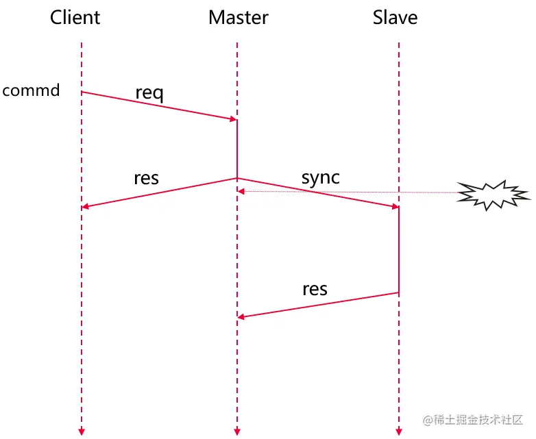 从上图可以看出,当Redis客户端向Master服务器发送一条命令时,Master服务器立即回复客户端命令的执行结果,并不等待命令同步到从服务器再回复,也就是说Redis的主从同步其实是异步的。