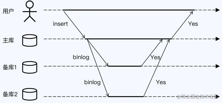 在该模式下,主库与备库同步 binlog 时,主库只有在收到两个备库的成功响应后,才能够向客户端反馈提交成功。显然,用户获得响应时,主库和备库的数据副本已经达成一致,所以后续的读操作肯定是没有问题的,这就是状态视角的“强一致”的模型。