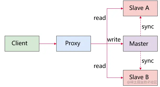 客户端首先通过代理向主节点 Master 进行了写入操作,此时由于没有实现强一致,写操作写完后立即返回;