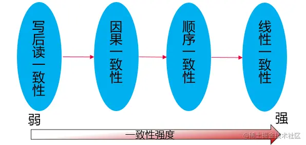 状态视角的强一致降低了系统的可用性,因此很多系统选择状态视角的弱一致性模型,通过额外的算法(如Raft、Paxos)在不保证所有节点状态的一致的情况下,来保证操作视角的一致性,同时提高了系统的可用性。通过加入一些限定条件,衍生出了若干种一致性模型: