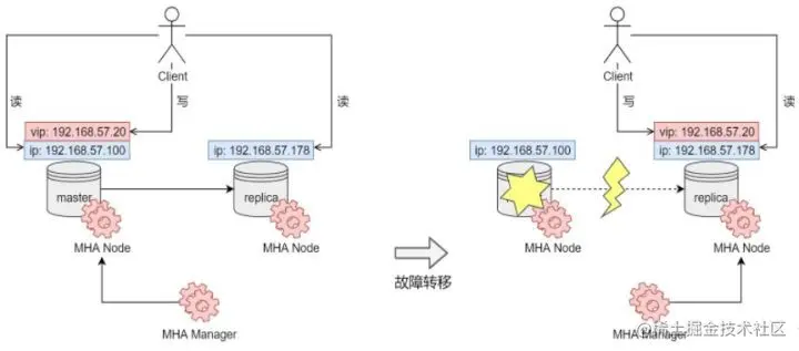 MHA由管理服务和Node服务组成,Node服务部署在每个MySQL节点上,MHA组件负责让MySQL的从库尽可能的追平主库,提供主从一致的状态。发生故障进行主从切换时,Manager首先为从库补充落后的数据,然后再将用户访问切换到从库,这个过程可能长达数十秒。