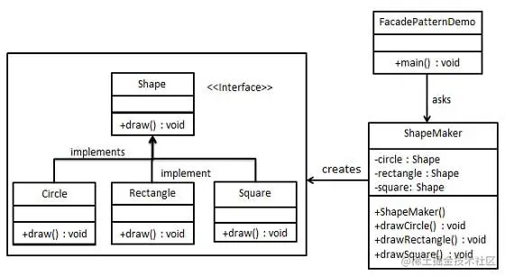 我们将创建一个 Shape 接口和实现了 Shape 接口的实体类。下一步是定义一个外观类 ShapeMaker。