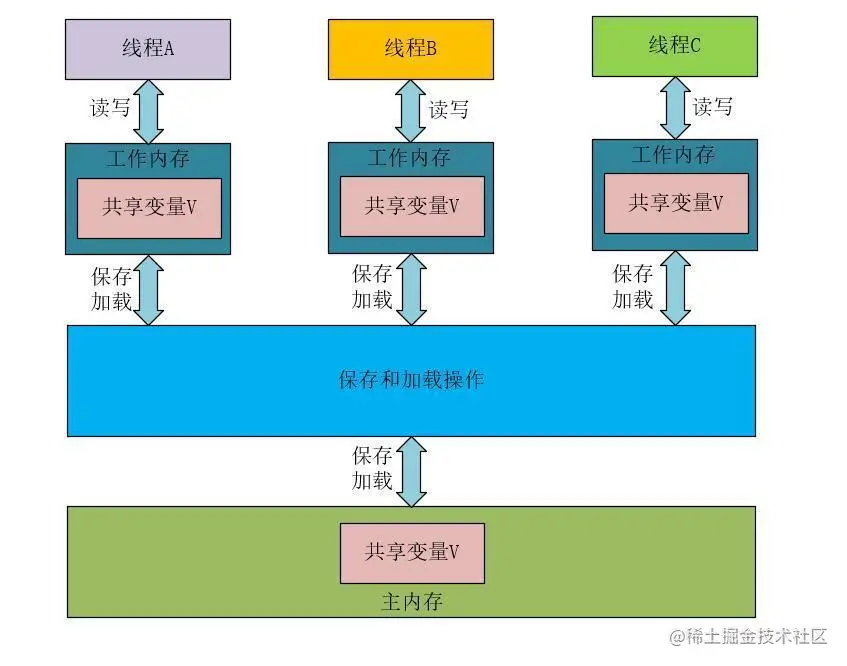 在内存里,Java内存模型规定了所有的变量都存储在主内存(物理内存)中,每条线程还有自己的工作内存,线程对变量的所有操作都必须在工作内存中进行。不同的线程无法访问其他线程的工作内存里的内容。我们可以使用下图来表示在逻辑上 线程、主内存、工作内存的三者交互关系。