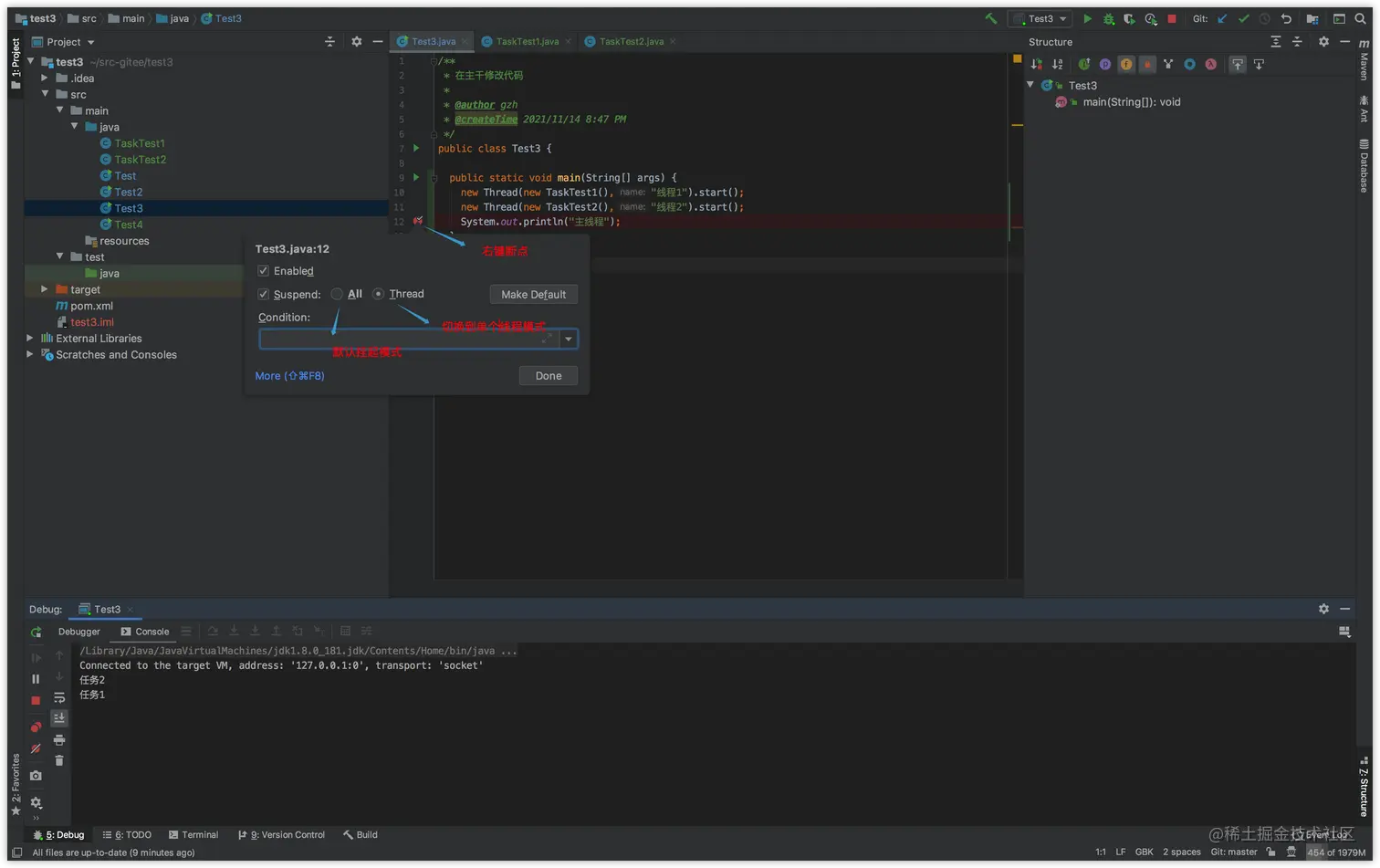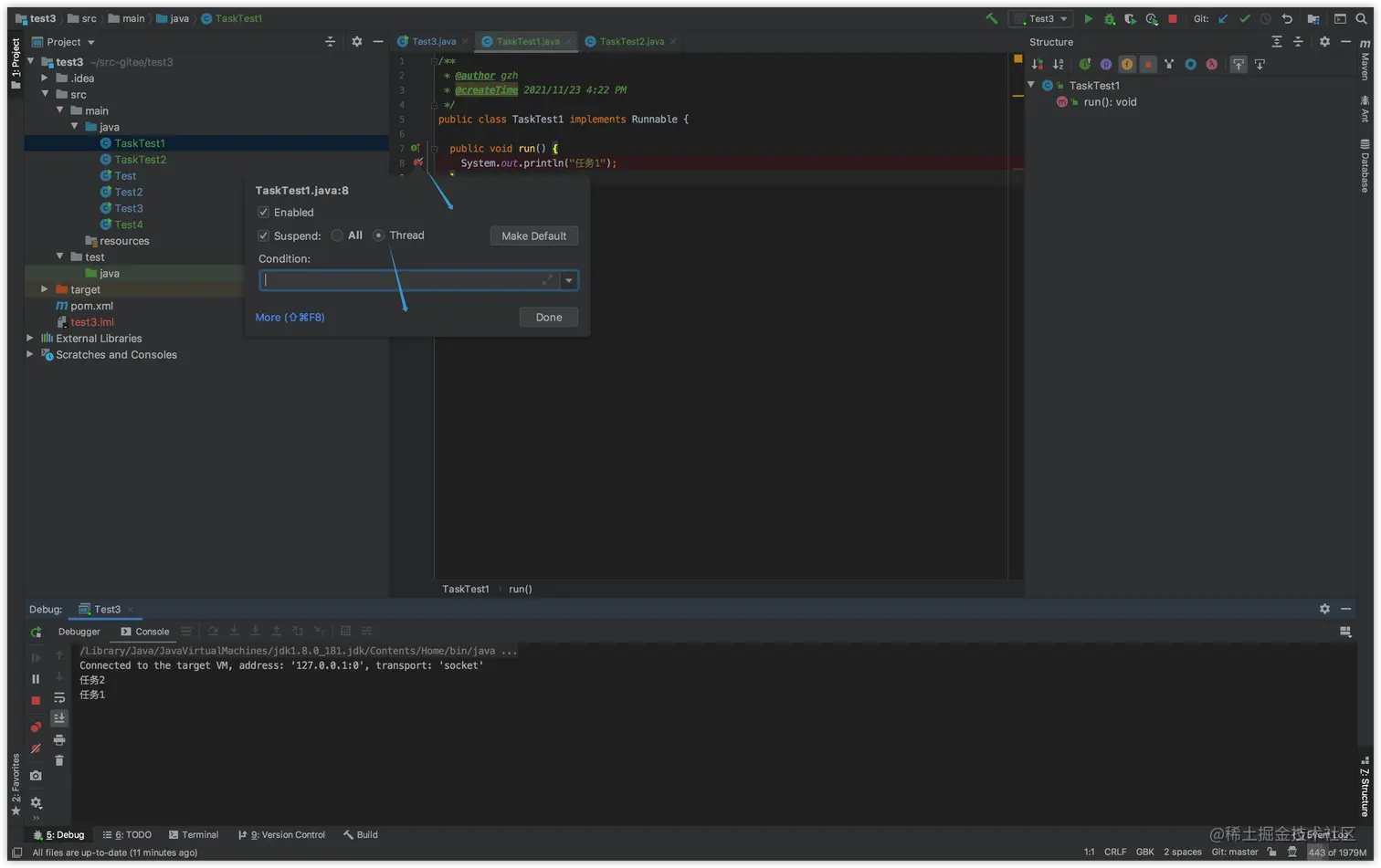 如果是多线程程序,我们调试的时候,当前执行到哪个线程,完全是随机的——这样的话,就不方便调试,因为我们很可能只想调试某个线程的代码。