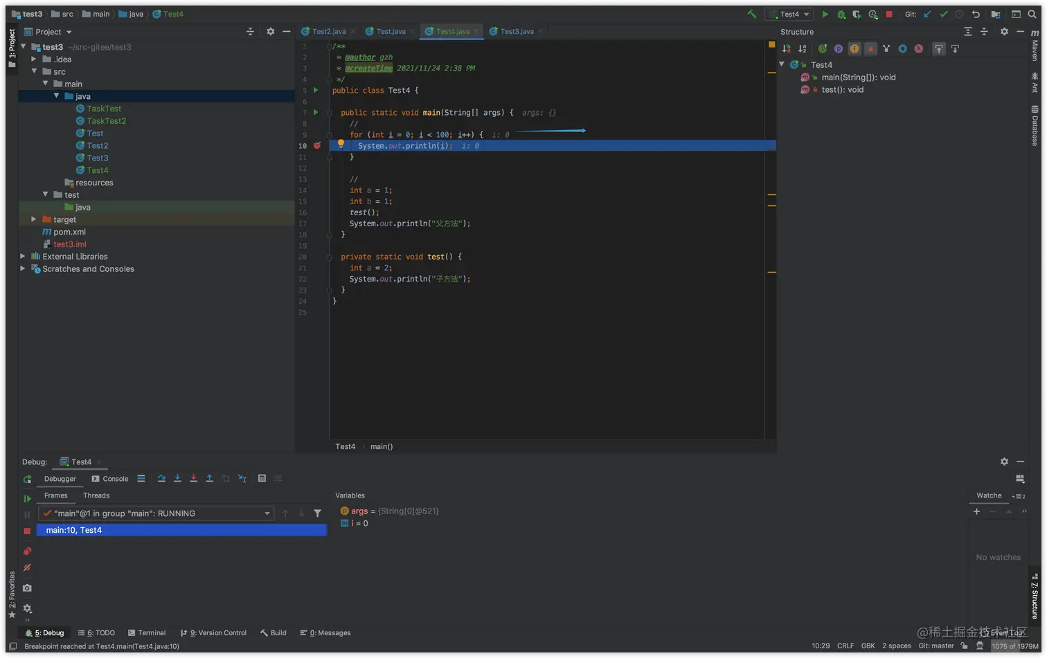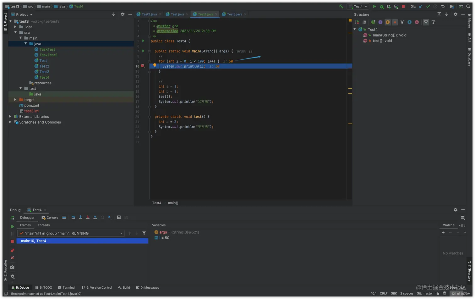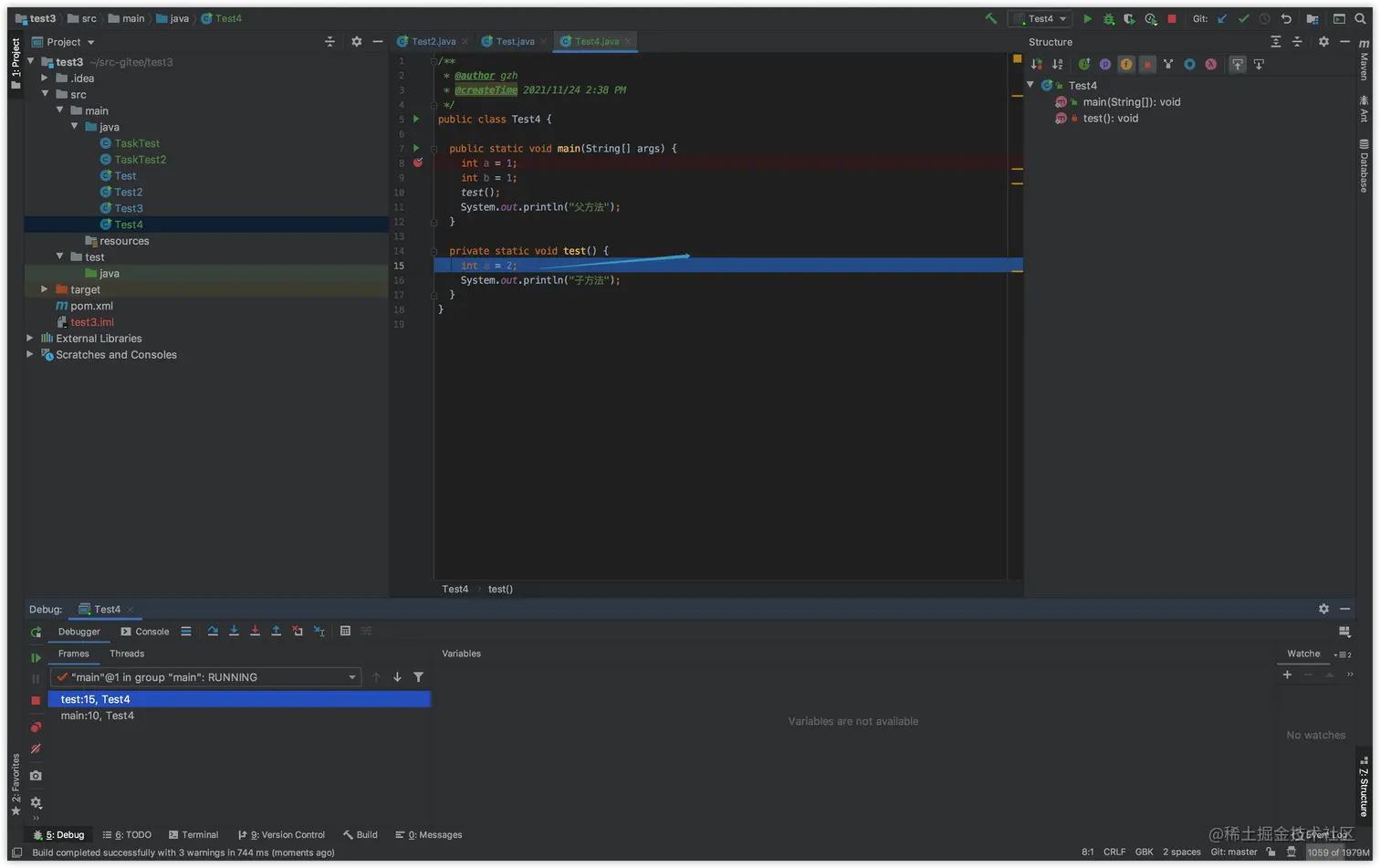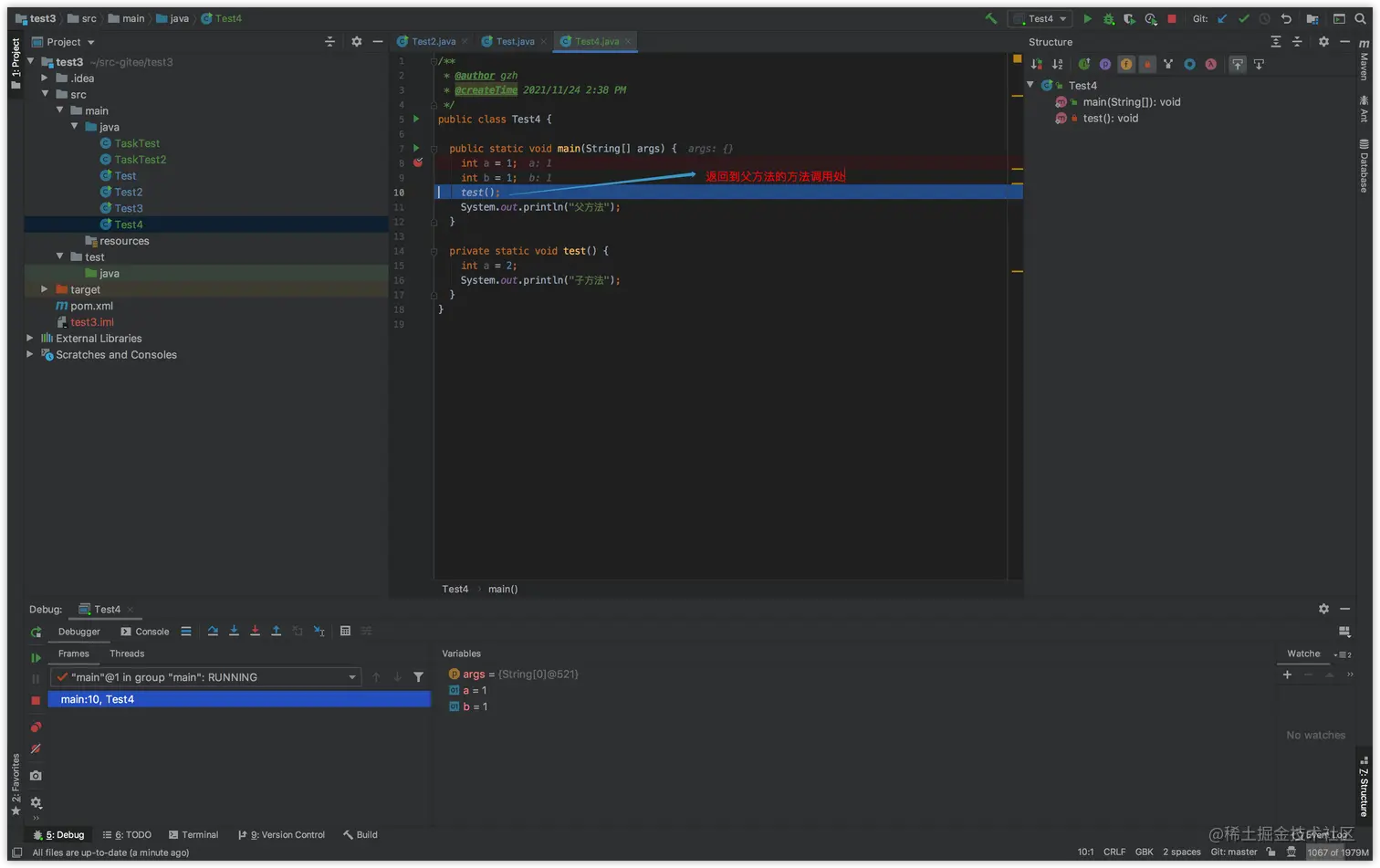 然后,我们就可以看父方法的变量了。注意,这里返回父方法,看起来好像和执行完成了子方法返回父方法是一样的,但是其实不是,如果真的是子方法执行完成,出了子方法之后,回到的是父方法调用子方法的下一行代码,而不是子方法调用处,因为子方法已经执行完成了,不能再次执行了。实际上,返回到父方法之后,然后又可以再次继续单步执行到子方法里。