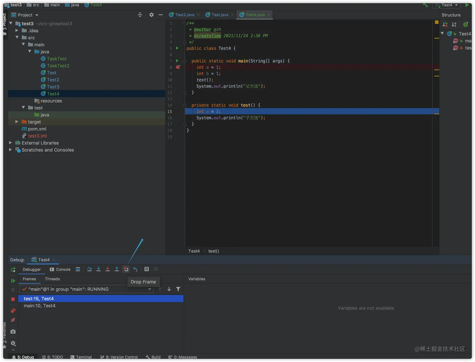 即点击drop frame按钮,就可以返回到父方法(在这里是main方法)。