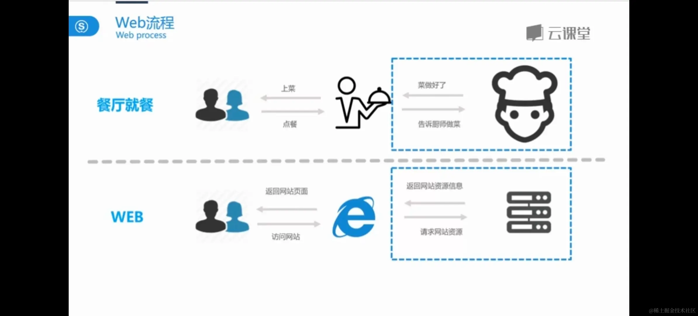 通常我们作为客户,只需要向服务员点餐、服务员上餐就可以了,而如果想要了解全过程,那Web的后续和餐厅订餐的后续也是很像的。