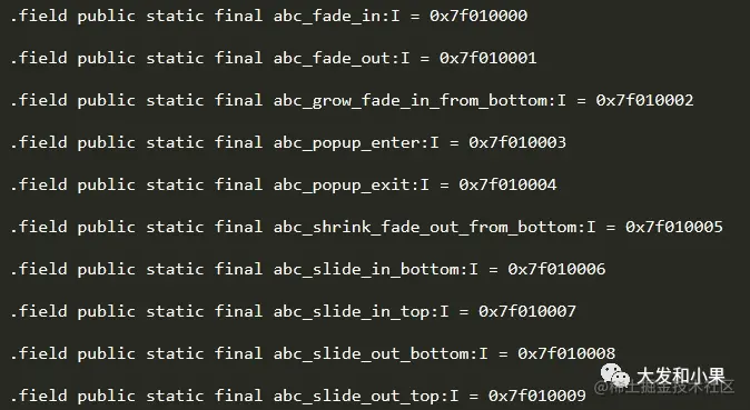 资源ID是一个32位的16进制整数,前8位代表app, 接下来8位代表typeId(string、layout、id等),从01开始累加,后面四位为资源id,从0000开始累加。随便反编译了一个apk,看一下其中一部分的结构: