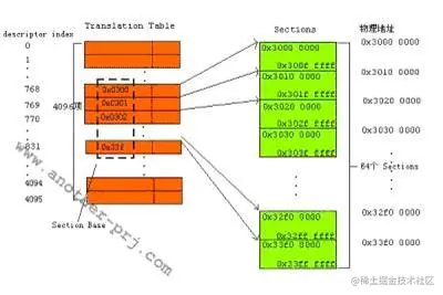 在Section模式下,送进MMU的虚拟地址(注1)被分为两部分(这点和我们上面举的例子是一样的),这两部分为 Descriptor Index(相当于上面例子的Page Index)和 Offset,descript index长度为12bit(2^12=4096,从这个关系式你能看出什么?:) ),Offset长度为20bit(2^20=1M,你又能看出什么?:)).观察一下一个描述符(Descriptor)中的Section Base Address部分,它长度为12 bit,里面的值是该虚拟段(页)映射成的物理段(页框)的物理地址前12bit,由于每一个物理段的长度都是1M,所以物理段首地址的后20bit总是为0x00000(每个Section都是以1M对齐),确定一个物理地址的方法是 物理页框基地址+虚拟地址中的偏移部分=Section Base Address<<20+Offset ,呵呵,可能你有点糊涂了,还是举一个实际例子说明吧。