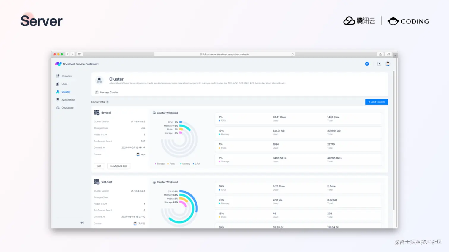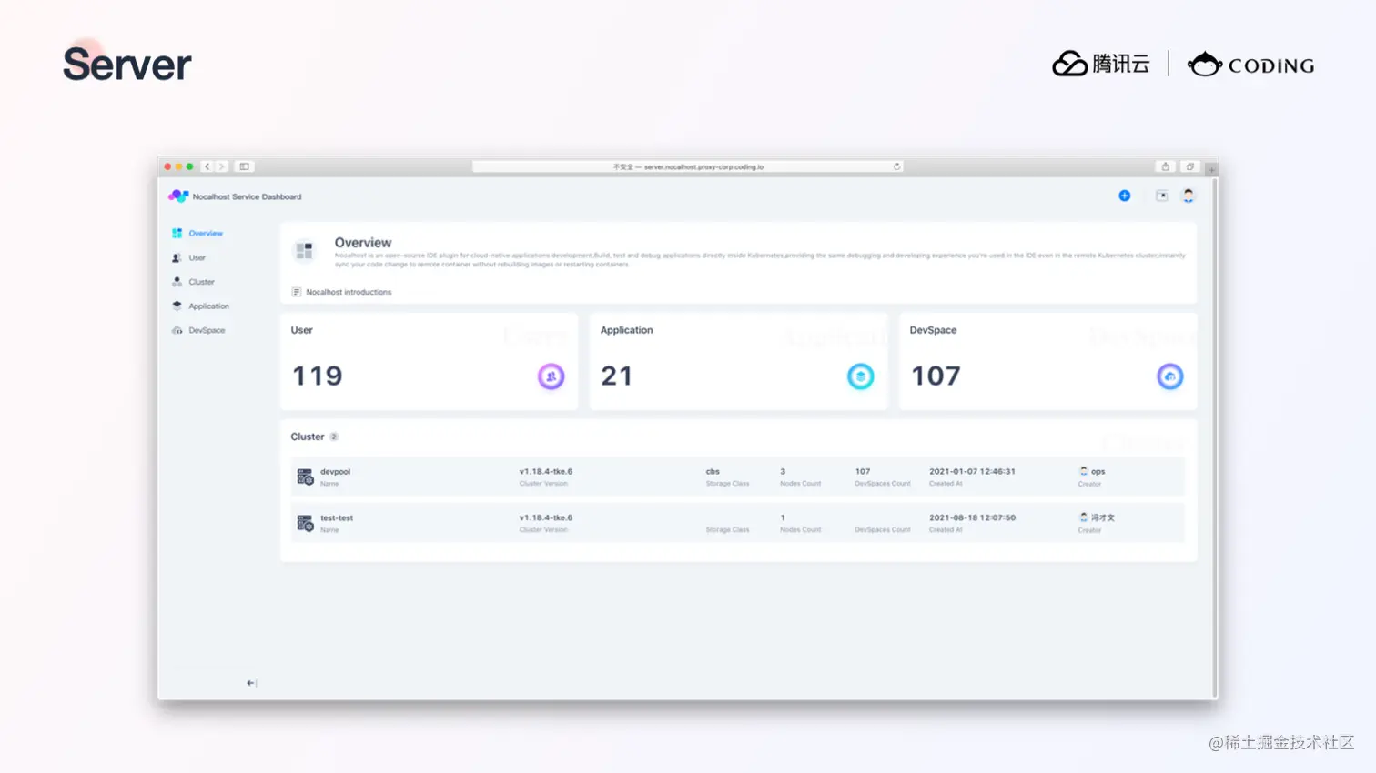 关于展望,在这次的分享中,我介绍了 Telepresence 和 Nocalhost 两种开发方式,它们在解决问题的思路上其实是各有不同的,你可以根据自己的业务情况选择一种方法来使用。此外 Nocalhost 提供了完整的开发环境和开发过程的管理能力,对于希望统一管理开发环境的团队,则可以安装 Nocalhost Server 来集中管理开发集群、应用、以及开发环境,当然 Server 也是开源并且免费的,我在这里提供几张 Server 的截图,感兴趣的同学可以遵循官方文档进行安装以及使用。